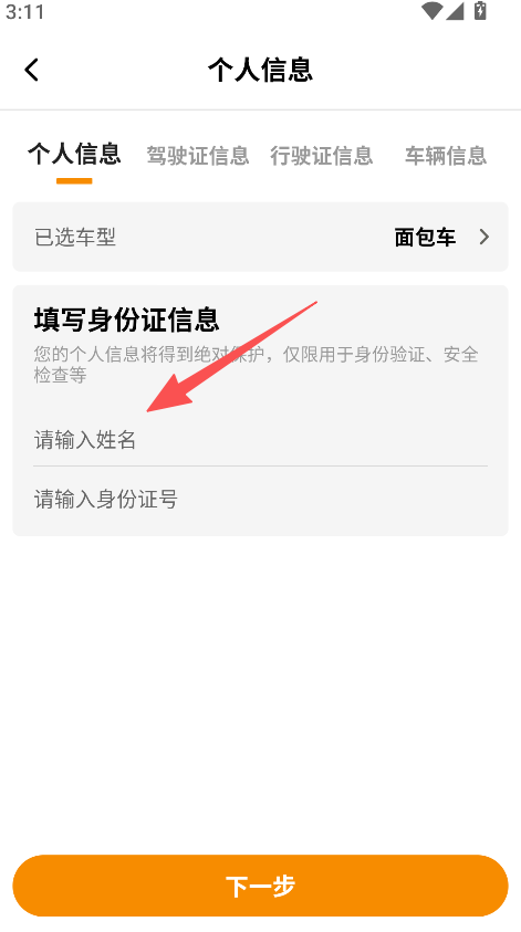3、实现个人信息注册功能,需填写姓名、身份证号等信息,完成注册流程,让司机合法合规开展拉货业务。