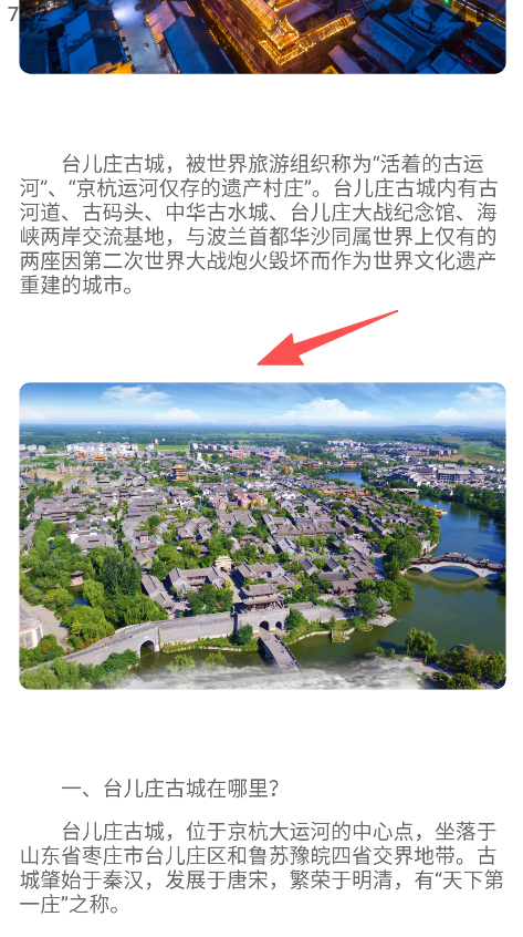 2、攻略详情详实,图文结合介绍景点,如台儿庄古城的历史、位置、景观等,让用户提前感受景点魅力。