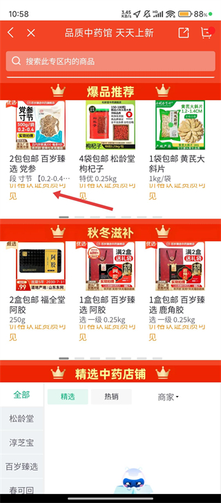 2、进入中药馆专区后,在爆品推荐区域点击【党参寸节】商品,就能进入该商品的详情页面。