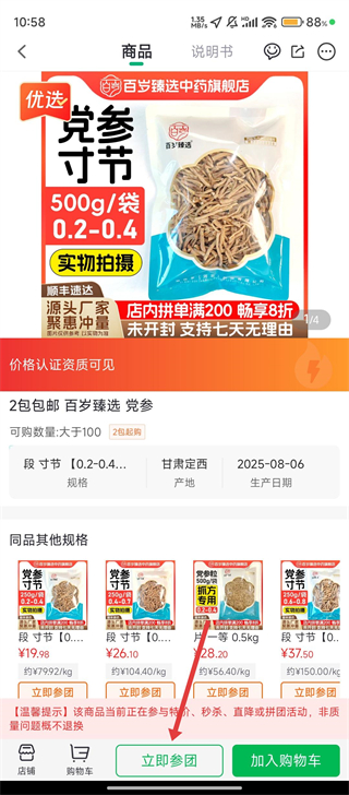 3、在商品详情页面,确认好规格、产地等信息后,点击底部【立即参团】按钮,进入参团的操作页面呢。