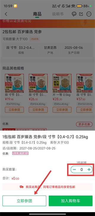 4、在参团页面,通过数量区域的【+按钮】调整购买数量,确认后点击【立即参团】,即可参与该商品的拼团啦。