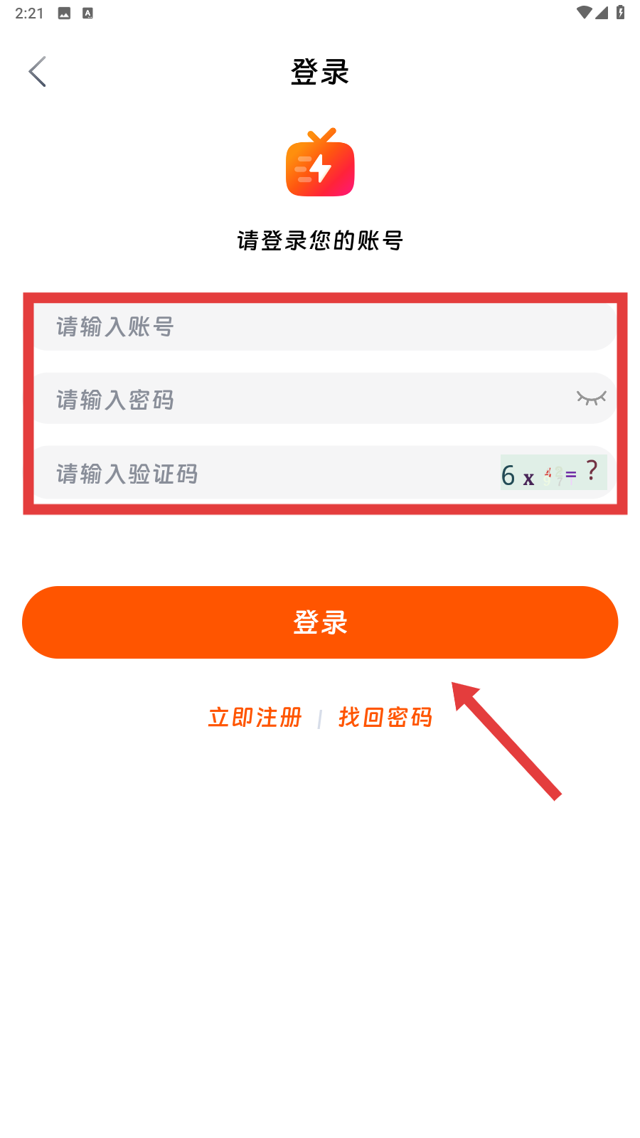 1、打开闪映影视,在登录界面输入账号等,再点击【登录】即可。