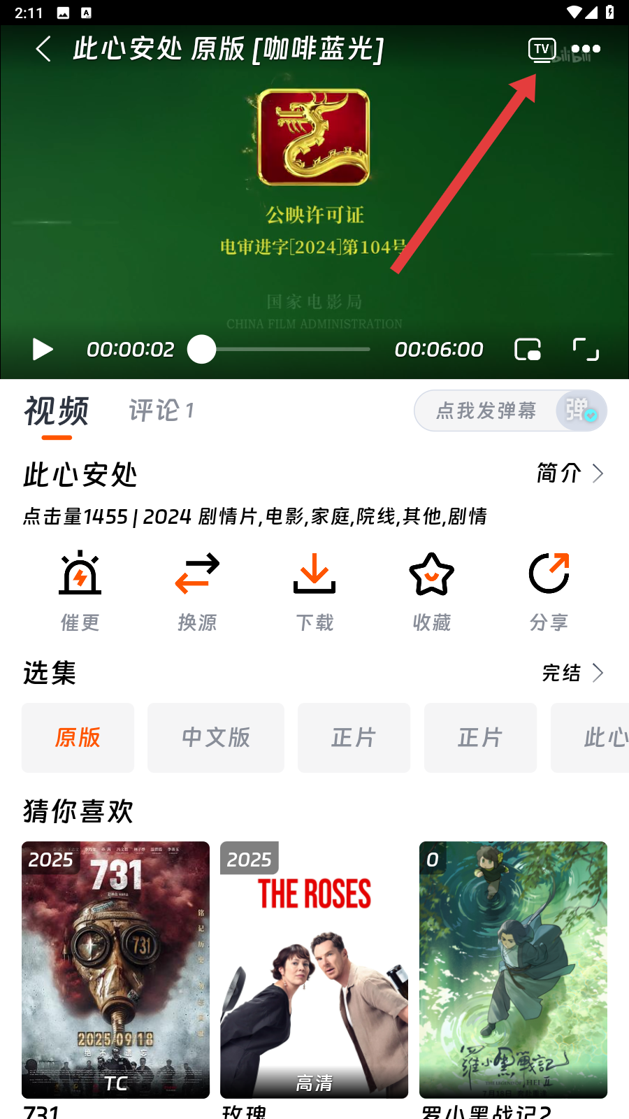 4、最后,在影片播放页右上角找到【TV】图标,点击它就能进行电视投屏,享受大屏观影啦。