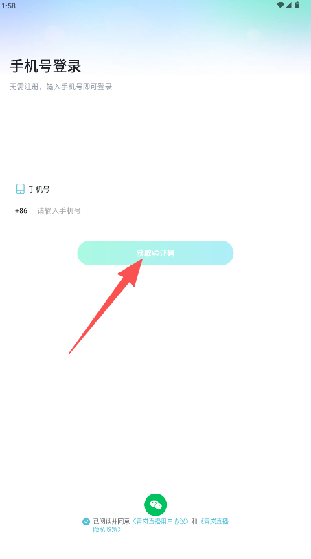 1、在登录界面输入手机号并获取验证码,完成账号登录。
