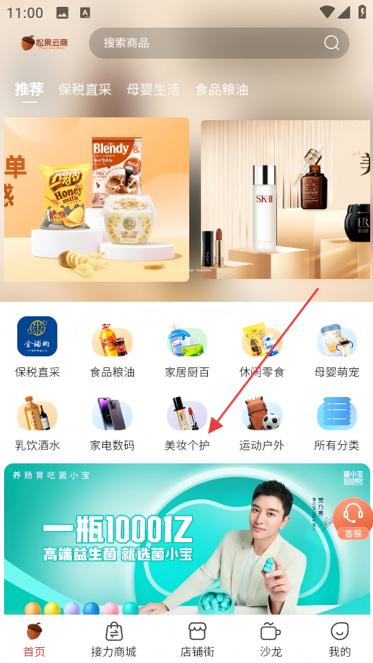 1、进入【松果云商】首页,点击【美妆个护】分类,进入美妆个护商品分类页面。