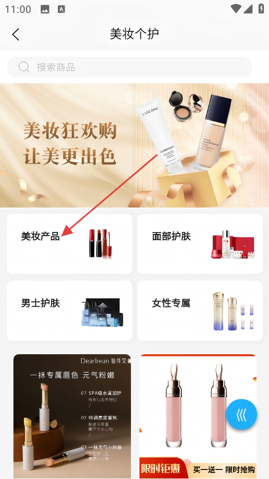 2、在【美妆个护】页面,点击【美妆产品】选项,进入美妆产品的商品列表页面。