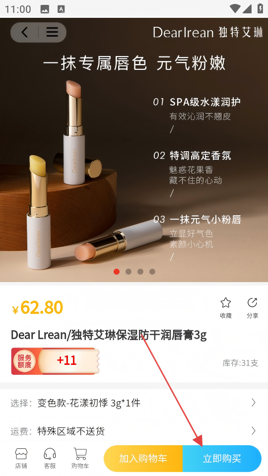 4、在商品详情页,查看商品信息后,点击【立即购买】按钮,可进行该美妆商品的购买操作。