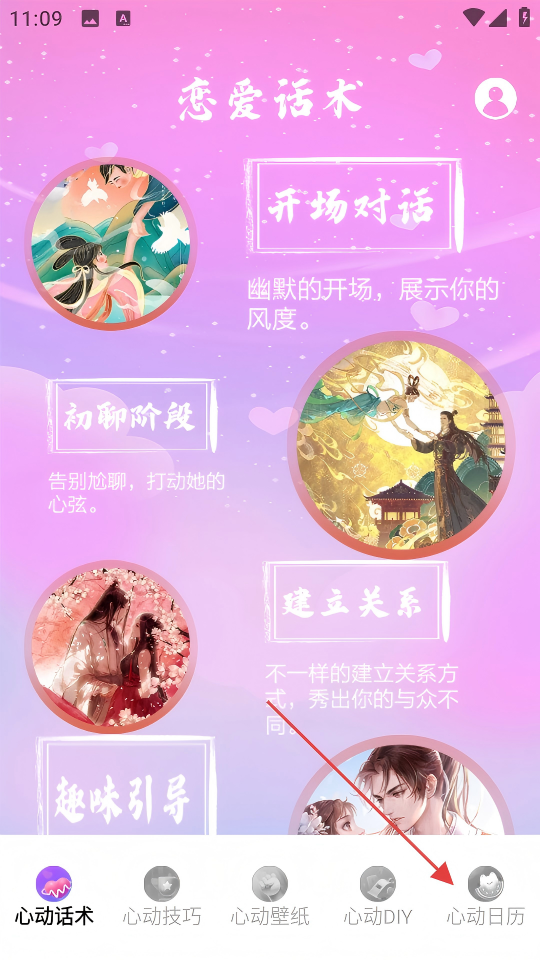 1、进入【恋爱话术】APP首页后,点击底部【心动日历】按钮。
