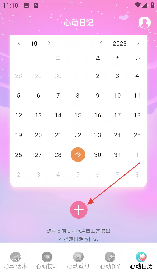 2、在【心动日记】页面,点击粉色加号按钮,进入日记编写页面。