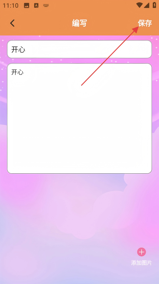 3、在日记【编写】页面,输入日记标题和内容后,点击右上角【保存】按钮。