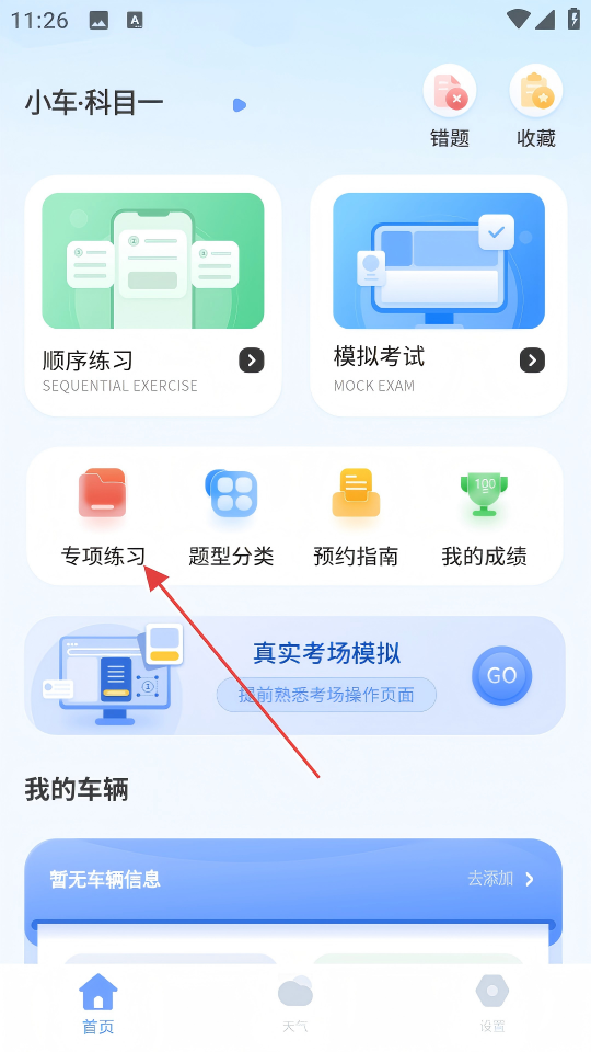 1、进入小车科目一学习首页,点击【专项练习】按钮,进入专项练习分类页面。
