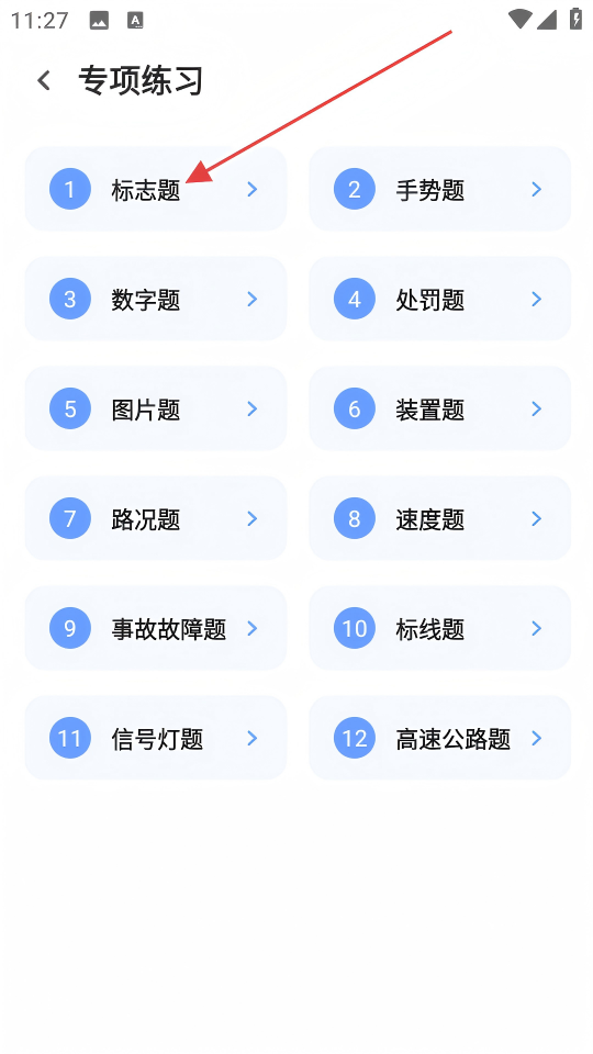 2、在专项练习页面,选择【标志题】分类,进入标志题的学习页面。