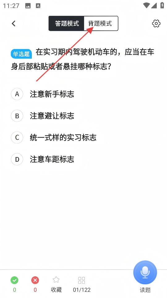 3、进入标志题学习页面后,可点击切换【背题模式】,以背题形式学习标志类题目。