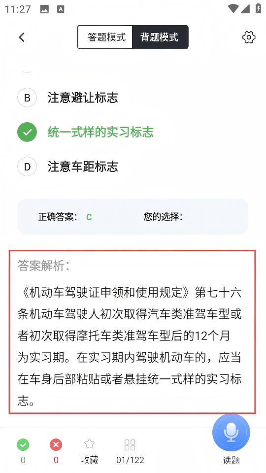4、在背题模式下完成题目作答后,可查看【答案解析】,通过解析内容巩固标志题知识点。