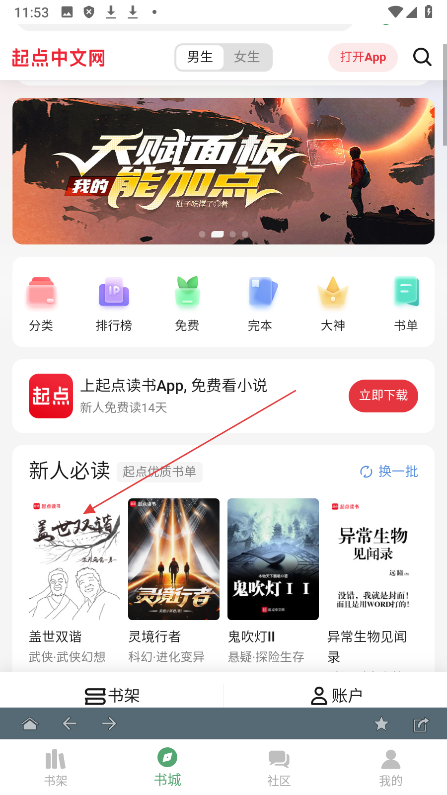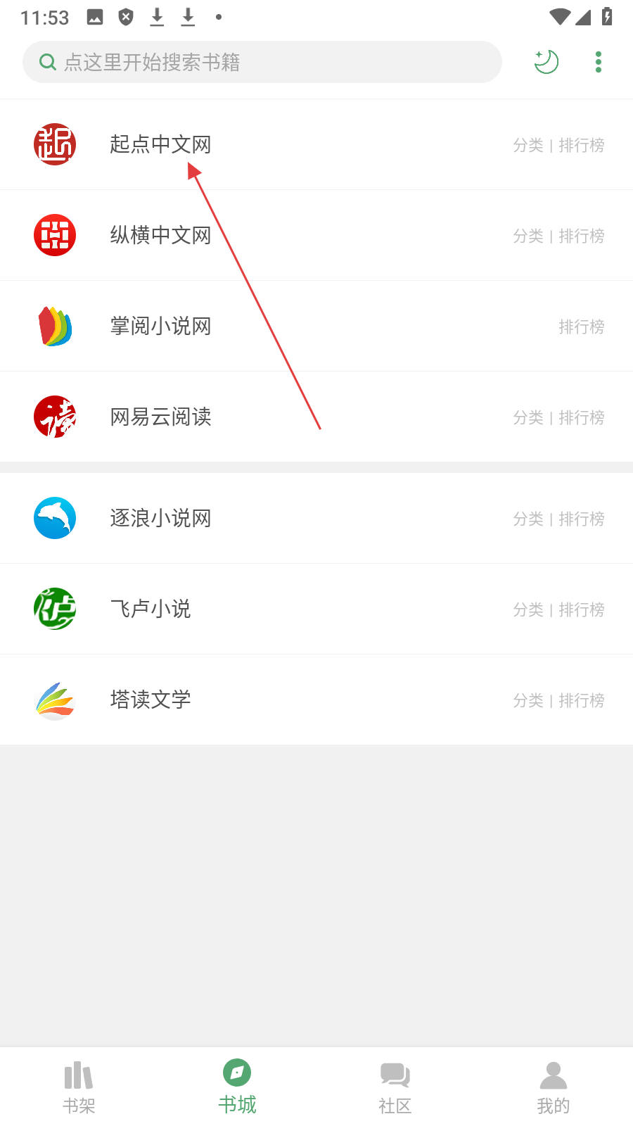 2、在书城页面,点击【起点中文网】,进入起点中文网页面。
