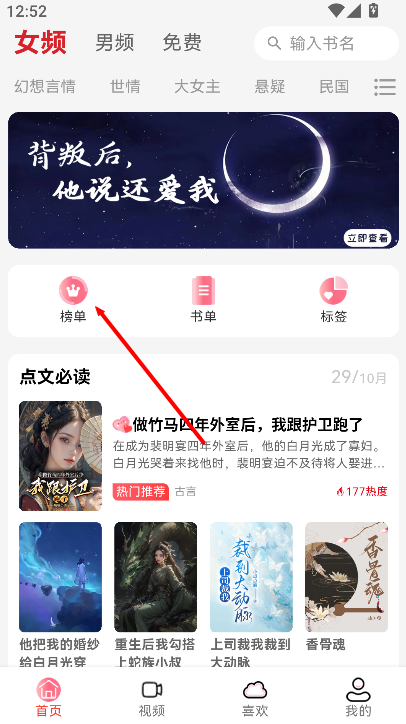 1、打开点文阅读APP进入女生频道,点击榜单即可浏览当前热门作品排行。