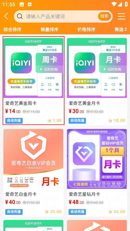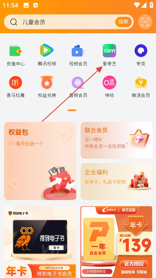 1、在会员服务平台首页,点击【爱奇艺】图标,进入爱奇艺会员商品列表页面。