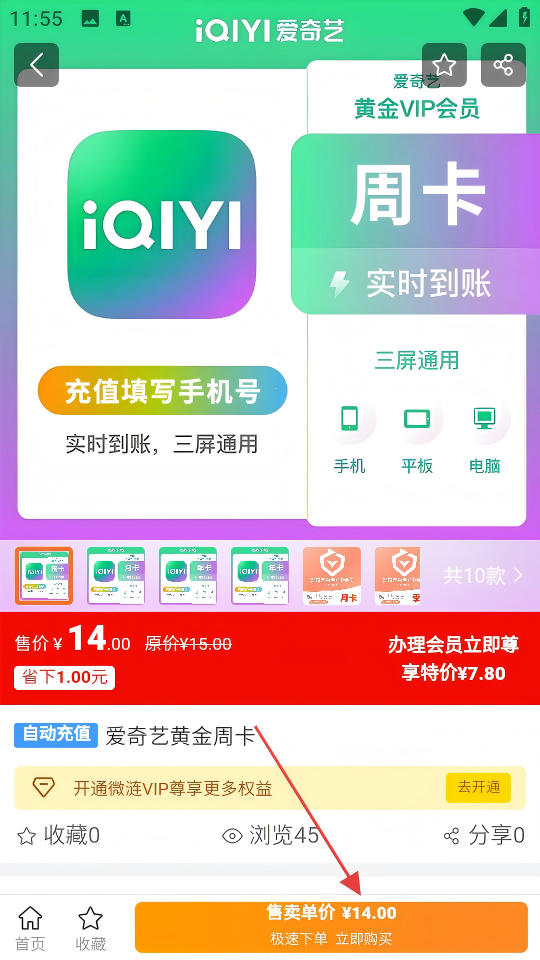 2、在爱奇艺会员商品列表页面,选择目标会员商品如【爱奇艺黄金周卡】,进入该商品详情页。