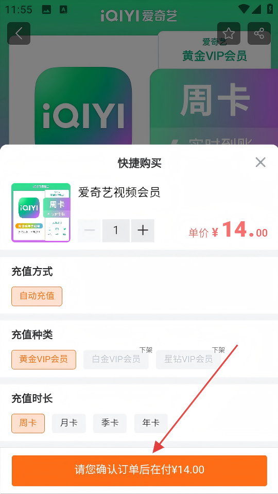 4、在【快捷购买】弹窗中,确认订单信息后,完成支付操作,即可购买爱奇艺会员。