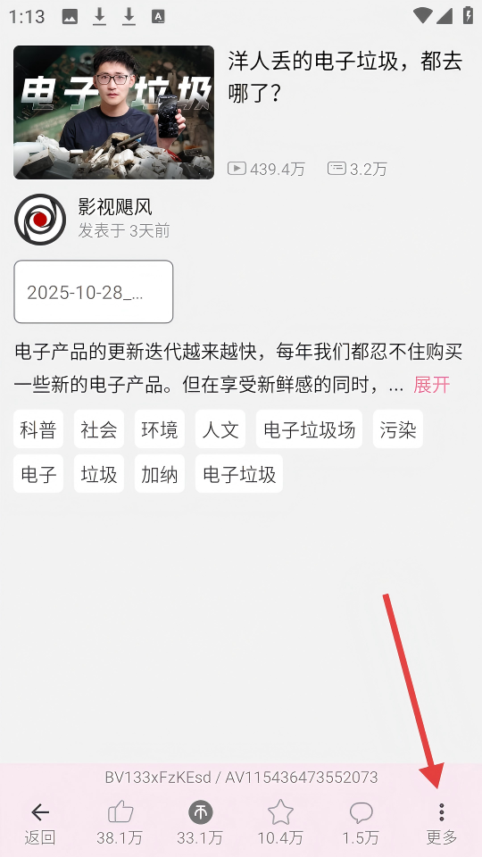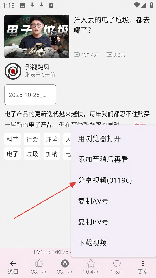4、在B站视频页,点击【更多】,可选择【分享视频(31196)】等操作,实现视频分享。