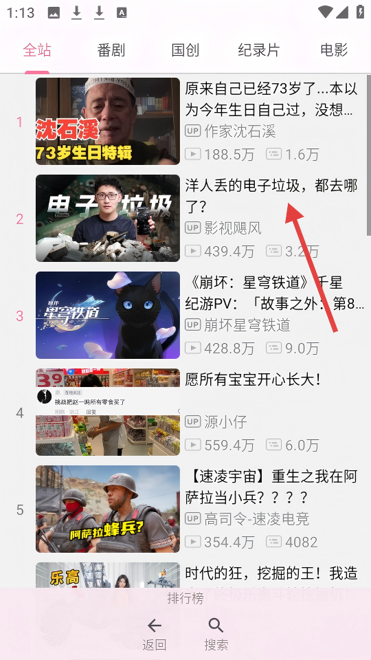 2、在排行榜中,可查看各类别热门内容,如【洋人丢的电子垃圾,都去哪了?】等视频的排名与数据。