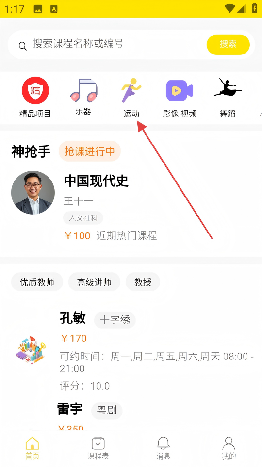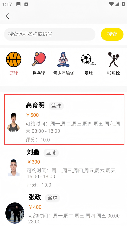 2、在运动课程页面,选择【篮球】分类下的高育明篮球课程条目,进入该课程详情页。