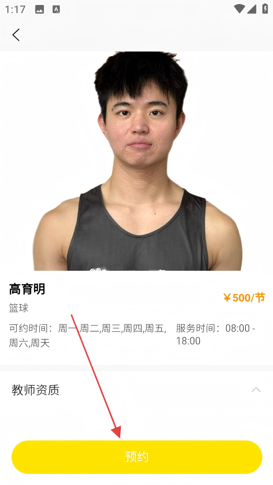 3、在高育明篮球课程详情页,点击【预约】按钮,进入确认选课页面。