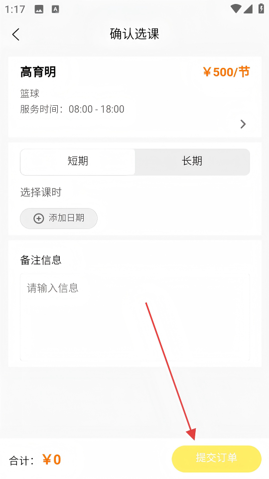 4、在确认选课页面,点击【提交订单】,完成篮球课程的预约选课操作。