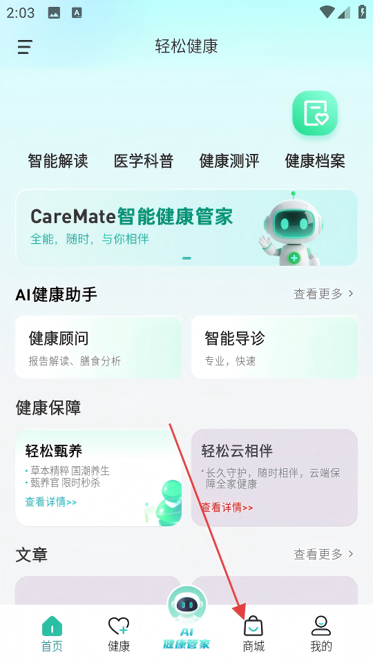 1、进入【轻松健康】APP首页后,点击底部【商城】按钮,进入轻松健康商城页面。