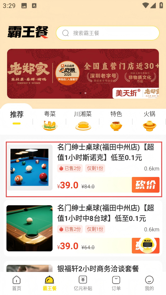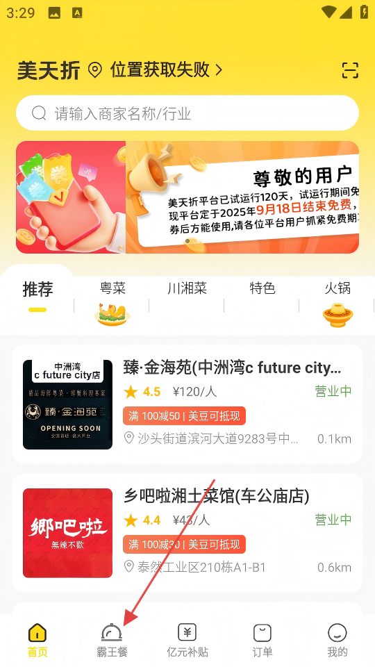 1、进入【美天折】APP首页,点击底部【霸王餐】按钮,进入霸王餐页面。