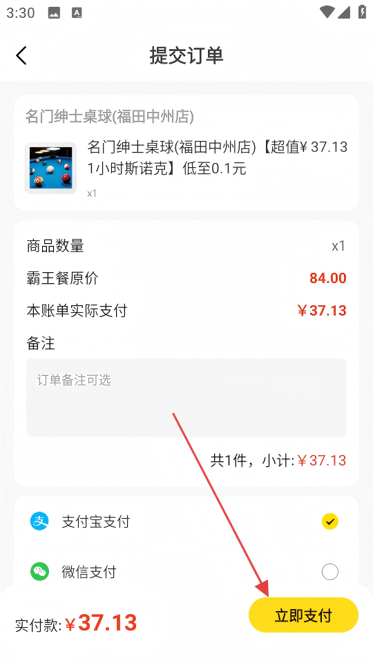 4、在提交订单页面,选择支付方式后点击【立即支付】,完成霸王餐商品的购买操作。