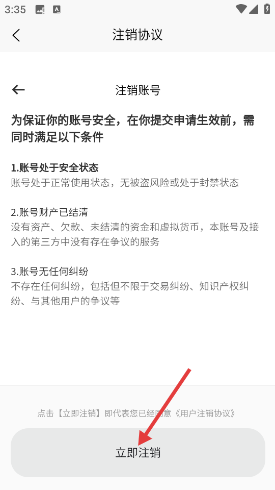 4、在注销协议页面确认满足注销条件后,点击【立即注销】完成账号注销操作。