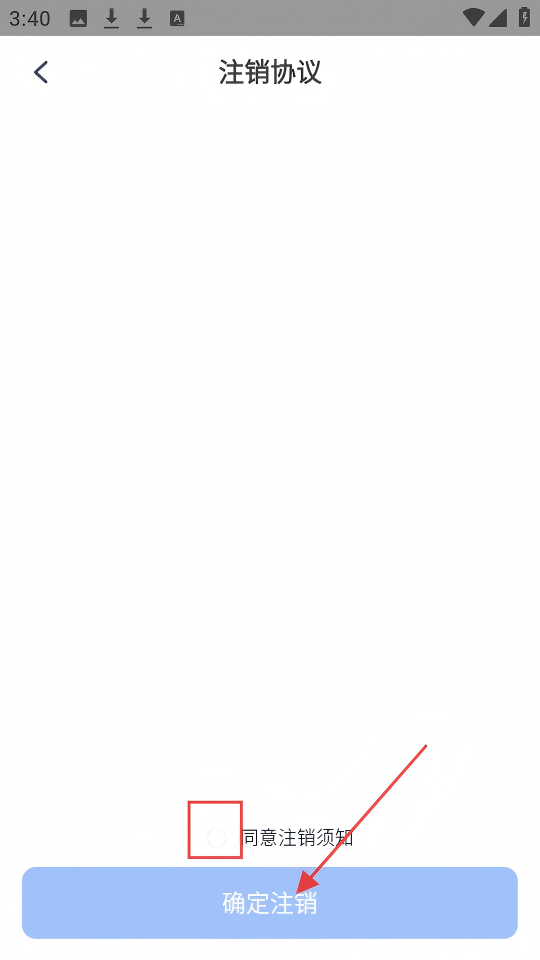 4、在注销协议页面勾选同意注销须知后点击【确定注销】可完成账号注销。