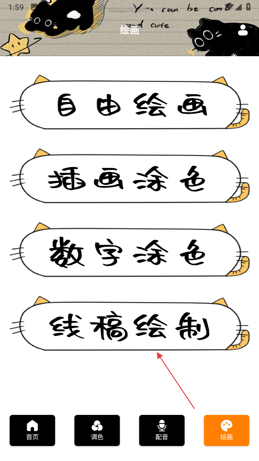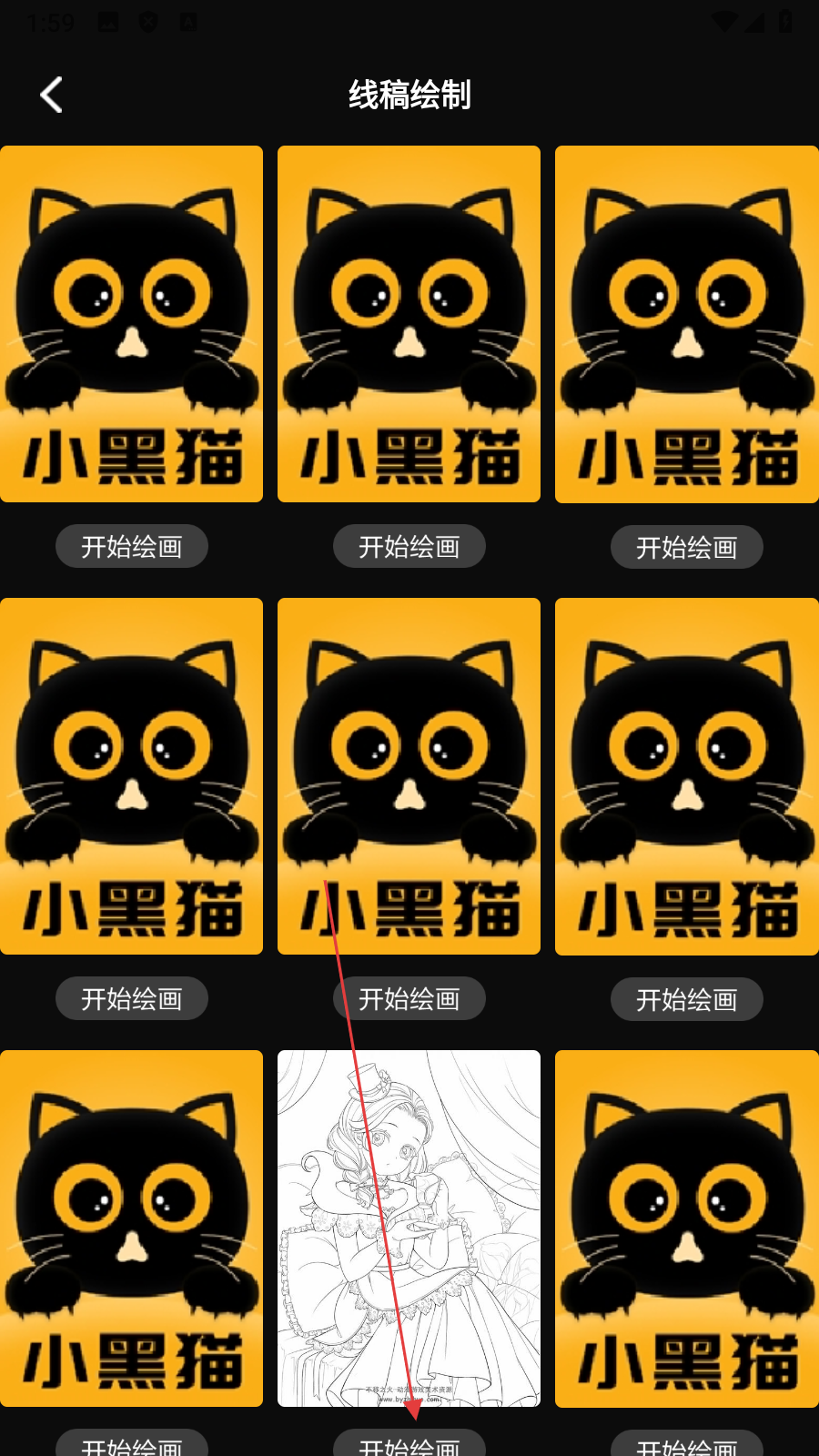 2、在绘画功能选择页面,点击【线稿绘制】,进入线稿选择页面。