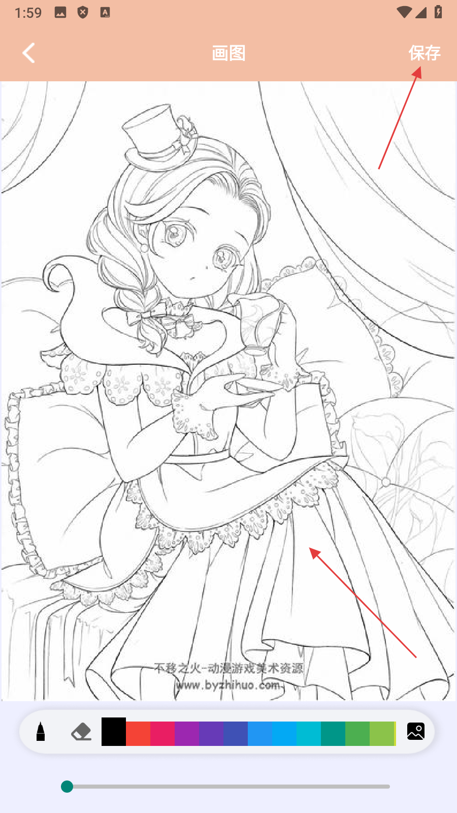 4、在画图页面完成绘制后,点击【保存】,即可完成线稿绘画作品保存操作。