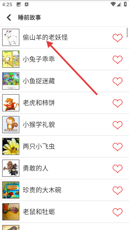3、在睡前故事列表页,选择《偷山羊的老妖怪》故事,进入故事阅读页。