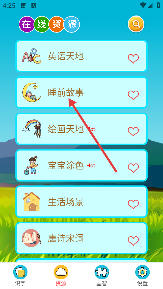 2、在资源页面点击【睡前故事】,进入睡前故事列表页。