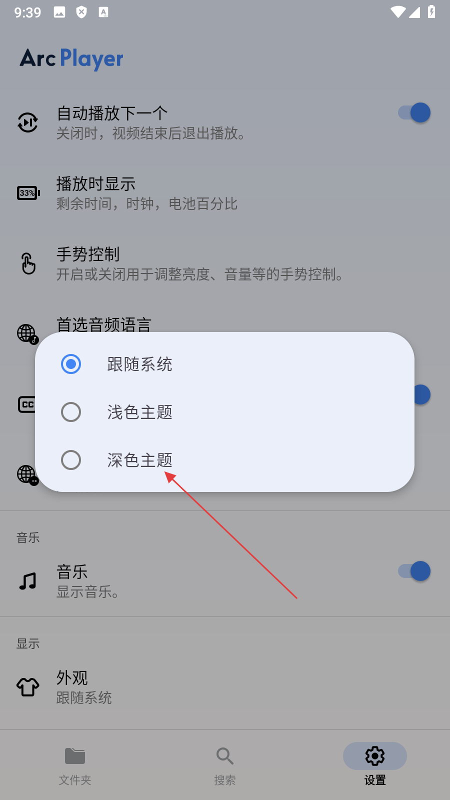 4、在外观主题选择框中,点击【深色主题】,即可完成播放器外观主题设置操作。