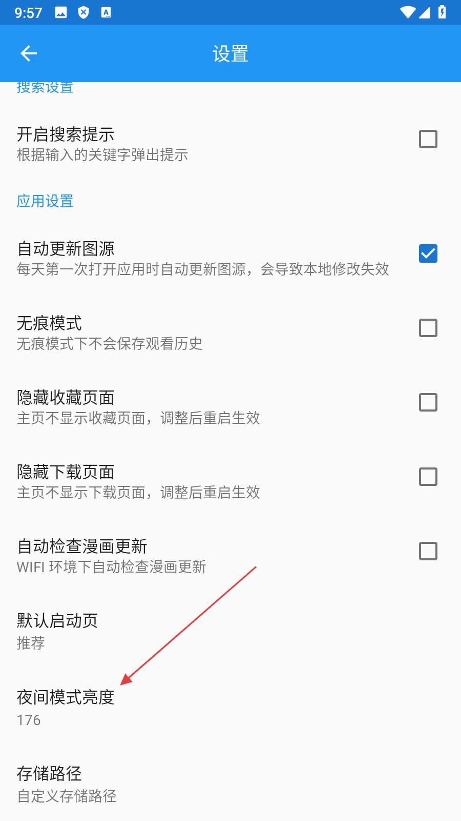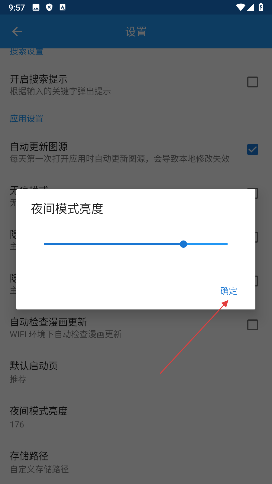 3、在设置页面点击【夜间模式亮度】,弹出亮度调节框。