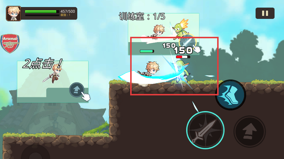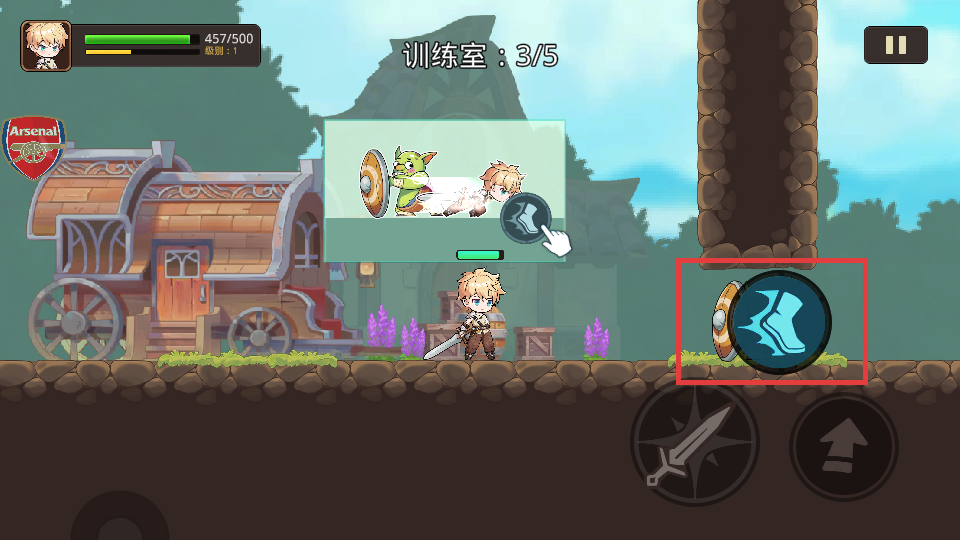 4、点击闪避按钮,躲避敌人盾牌,提升生存能力,顺利通过训练室。