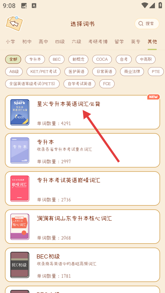1、在选择词书页面,选择【星火专升本英语词汇必背】词书。