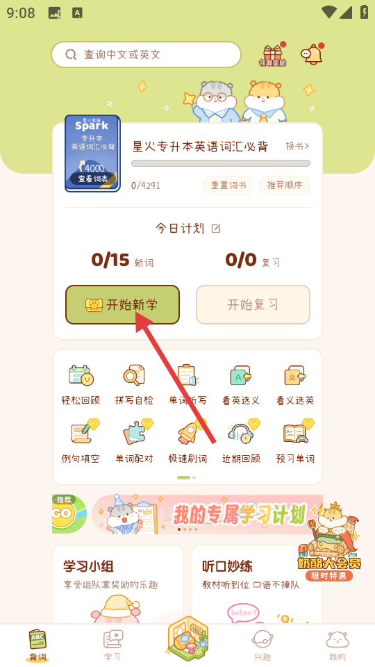 3、在背词页面,点击【开始新学】按钮,进入单词学习环节。