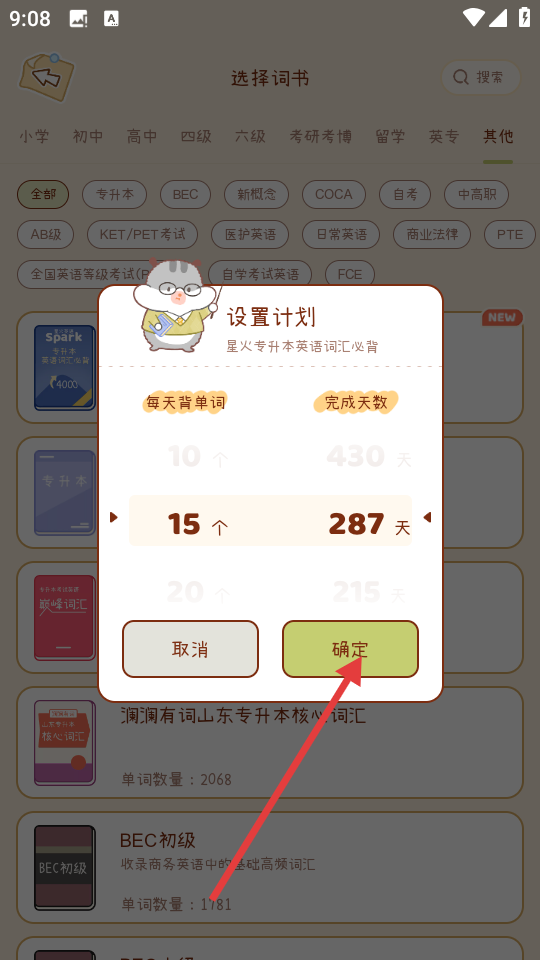 2、在设置计划弹窗中,设置每天背单词数量和完成天数后,点击【确定】。