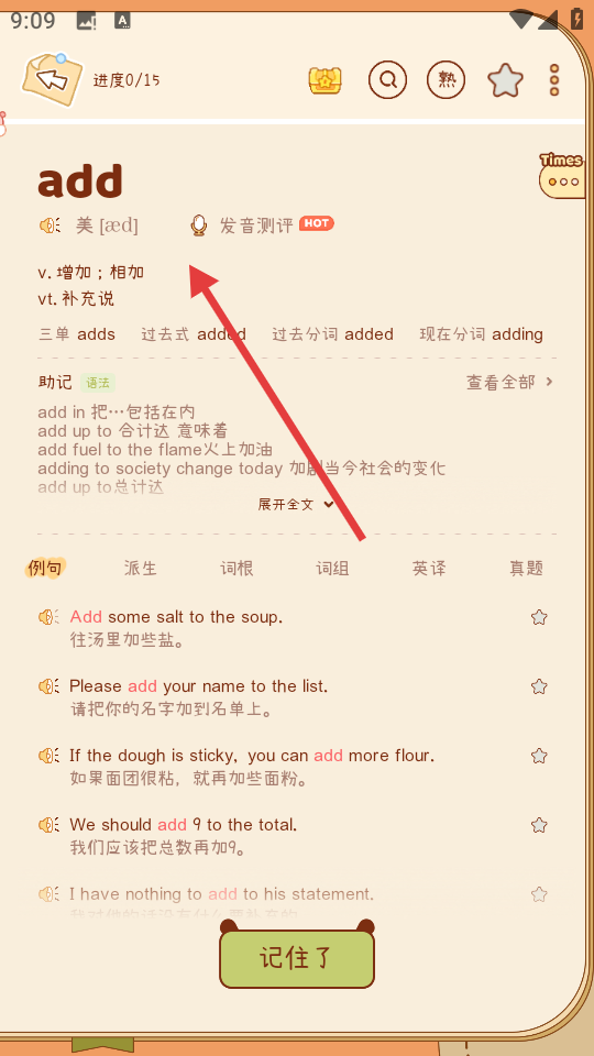 4、在单词学习页面,可查看单词【add】的发音、释义等内容,学习后点击【记住了】完成该单词学习。