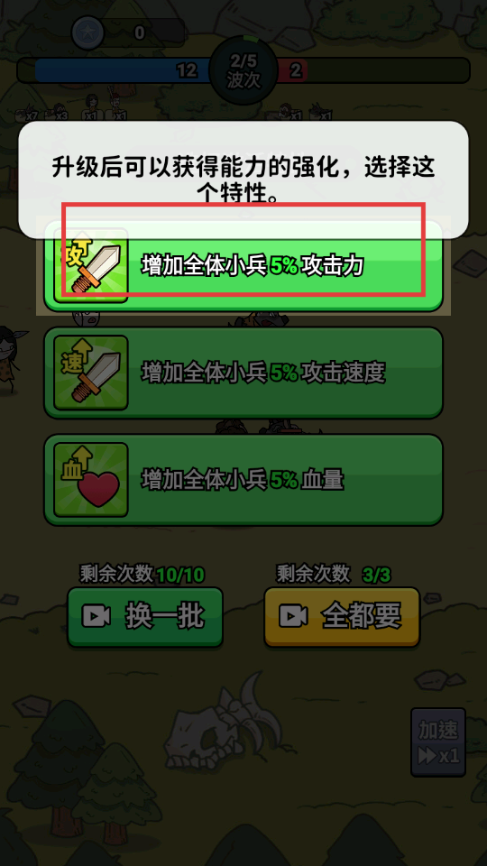 4、选择【增加全体小兵5%攻击力】特性,强化小兵能力,提升战斗效率。