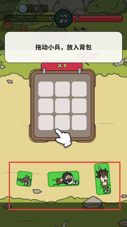 1、拖动小兵放入背包,组建自己的战斗队伍,为迎战敌人做准备。