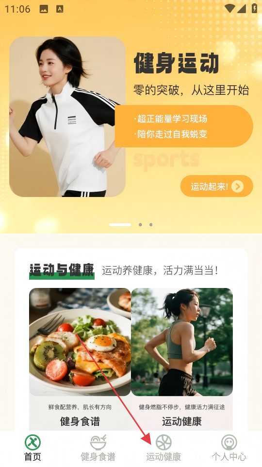 1、进入健身APP首页,点击底部【运动健康】按钮,进入运动健康页面。