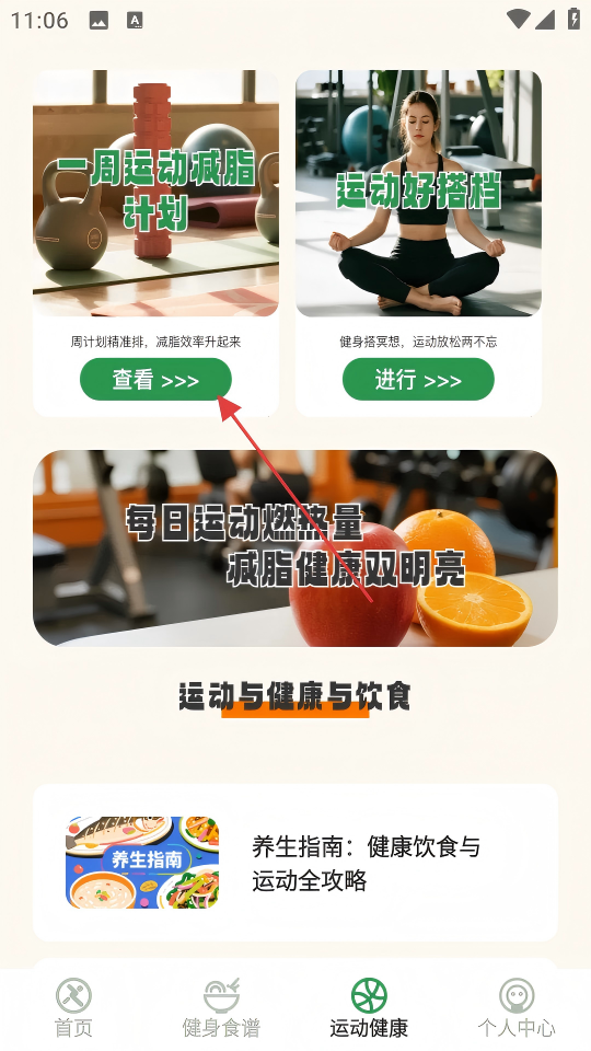 2、在运动健康页面,点击【一周运动减脂计划-查看】按钮,进入七天运动减脂计划页面。