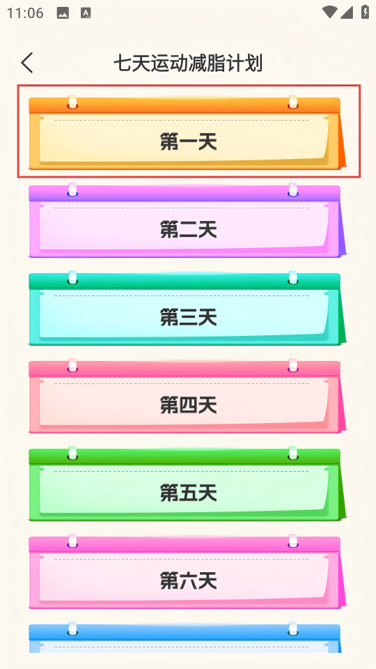 3、在七天运动减脂计划页面,点击【第一天】选项,进入第一天详情页面。
