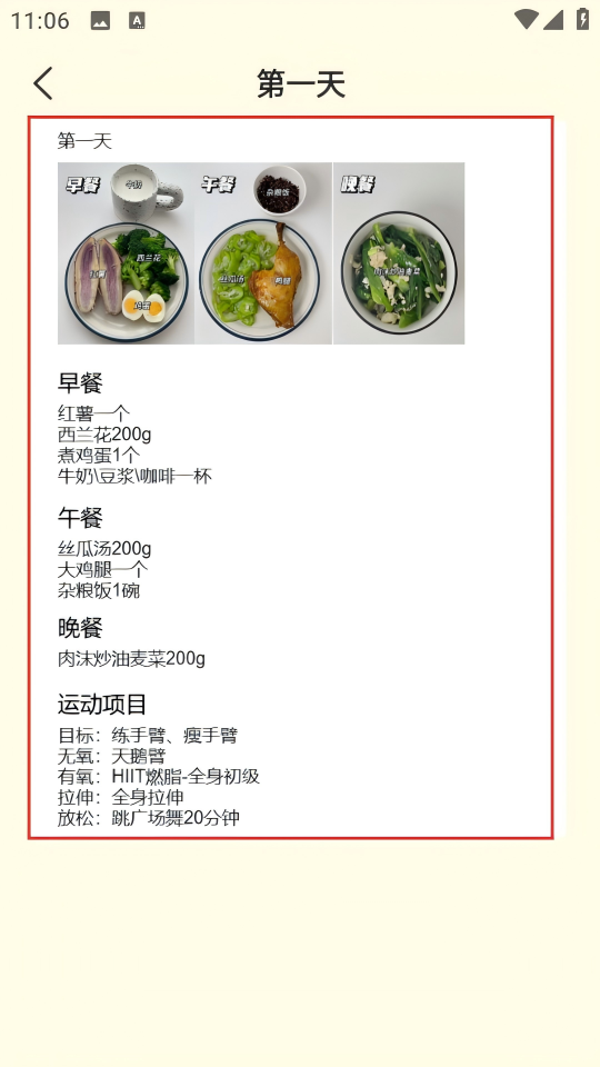 4、在第一天详情页面,查看健身食谱和运动项目详情。